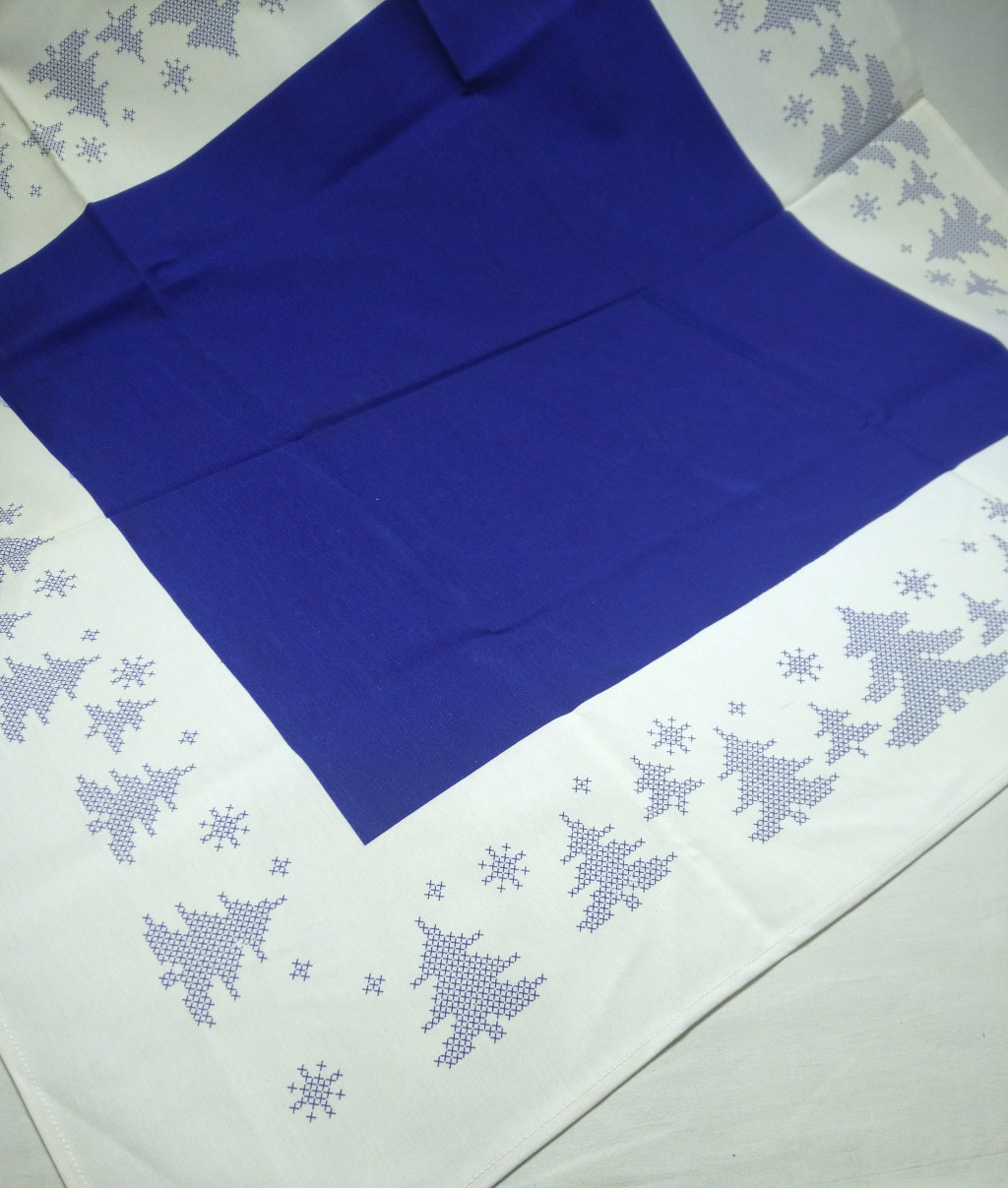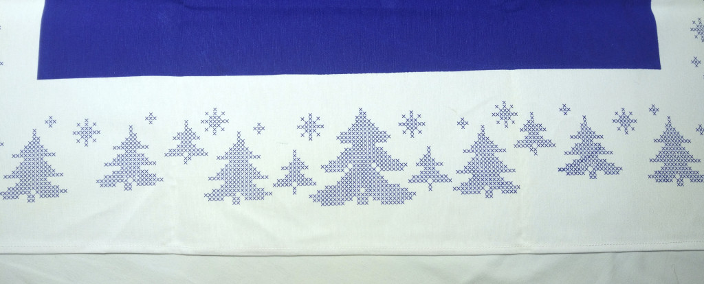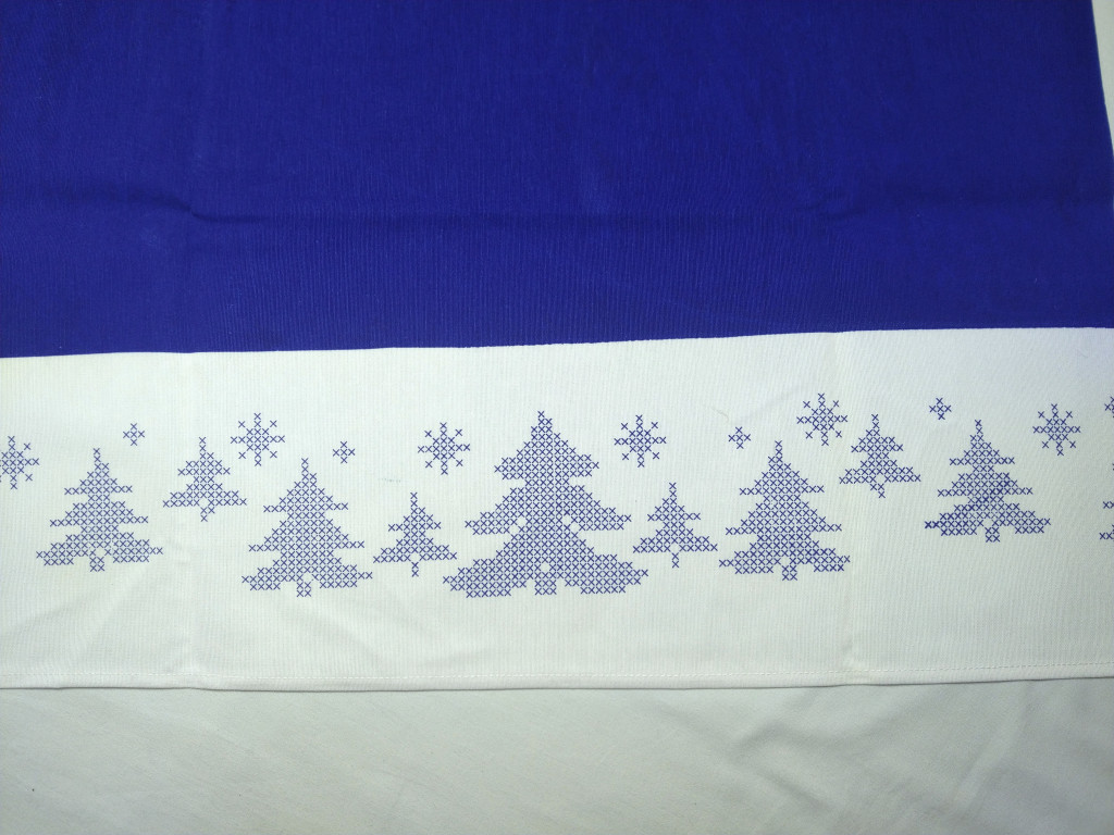 A terítő fehér pamut alapra készült, szélei mentén előfestett keresztszemes fenyőfákkal és hópelyhekkel, így a minta könnyen hímezhető, jól követhető.