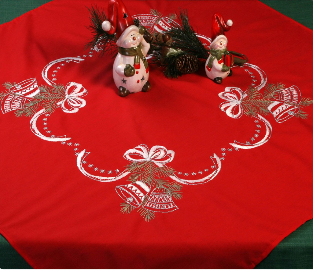Ez a gyönyörű, piros szalagos karácsonyi harangok mintás előfestett terítő tökéletes választás karácsonyi asztalra vagy akár ajándéknak.