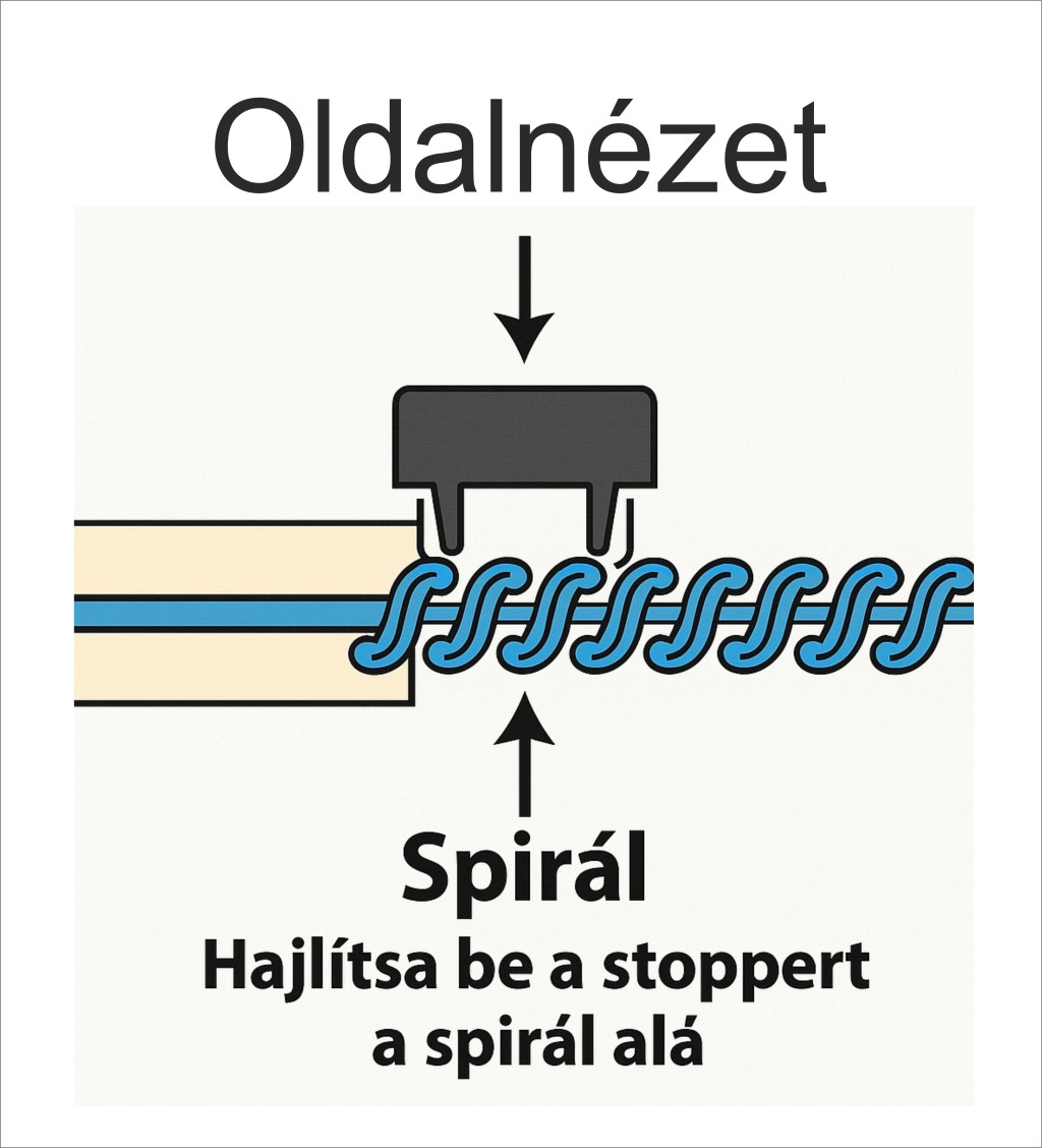 A pontos és stabil illesztés érdekében a spirálra helyezd a stoppert, a lábait szúrd be a spirál mellett alólra és hajlítsd be a lábakat a spirál alá, így biztosan rögzül, és nem mozdul el használat közben. A lábak benyomásához használhatsz lapos fogót, vagy kalapácsot.