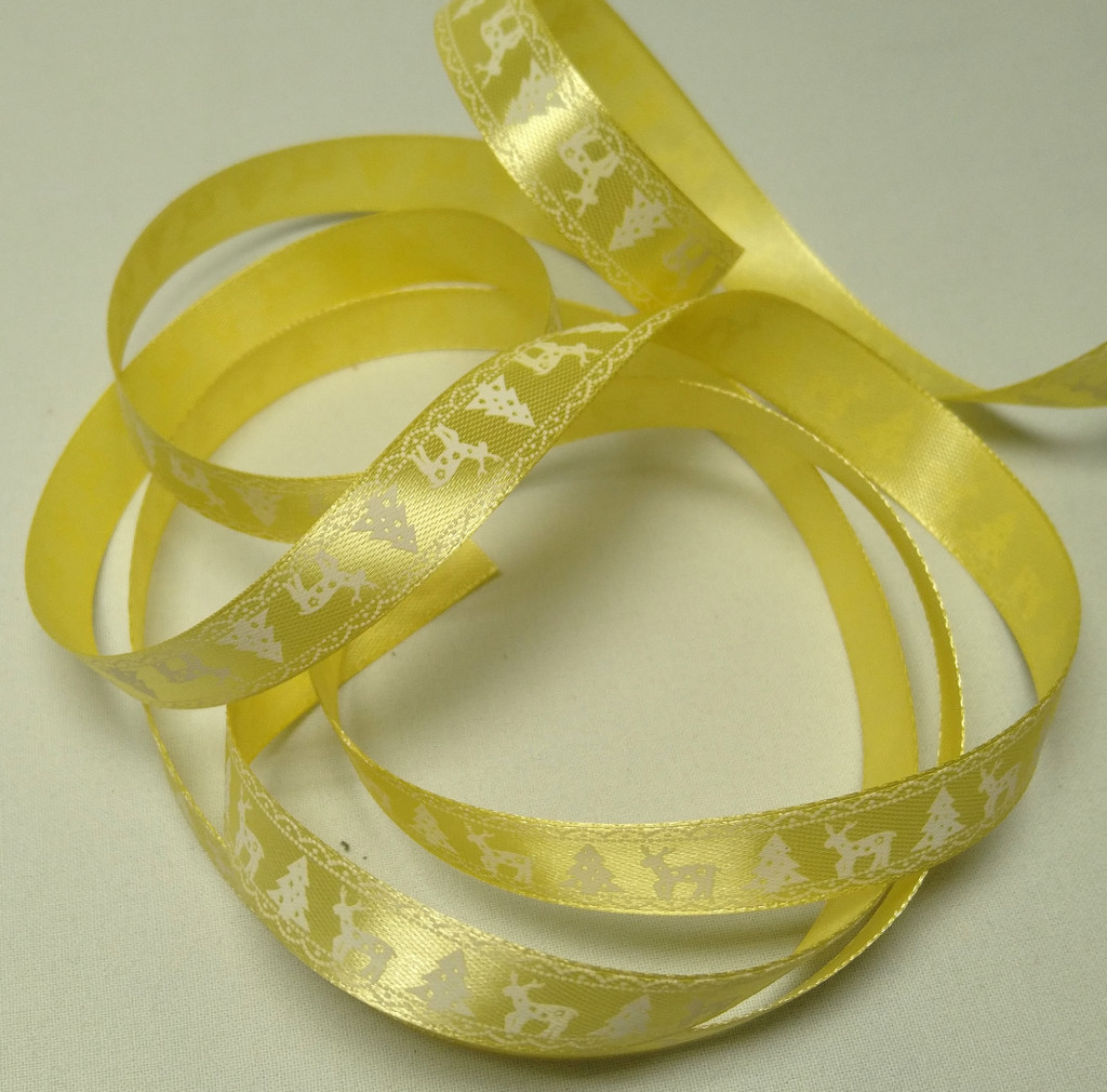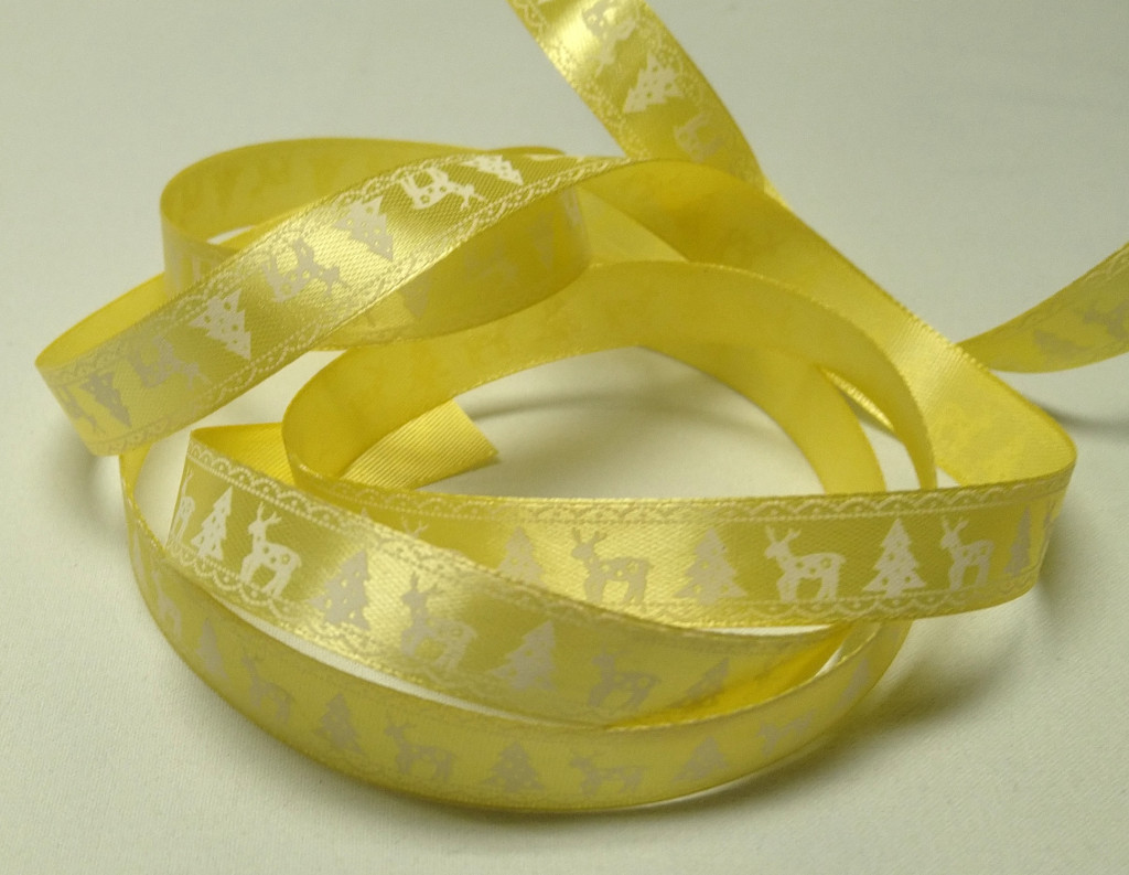 Karácsonyi szatén szalag – aranysárga, rénszarvasos és fenyőfás mintával