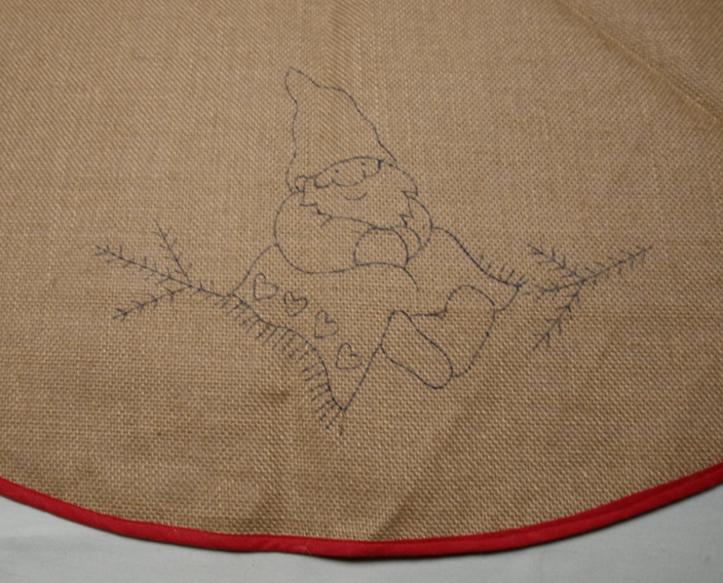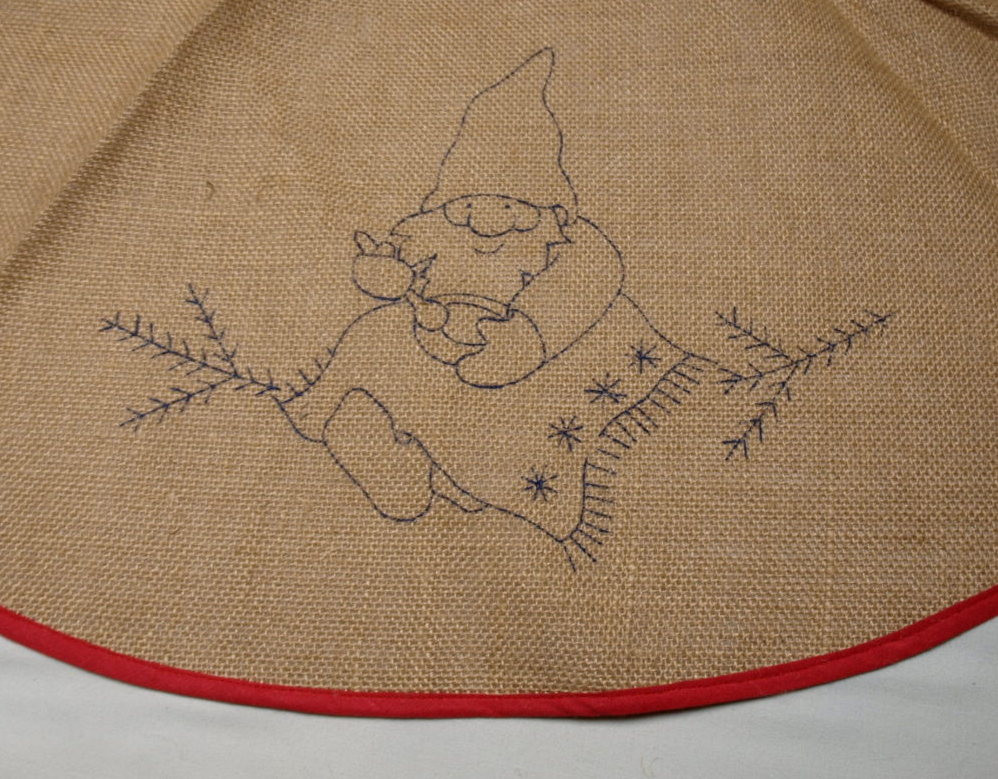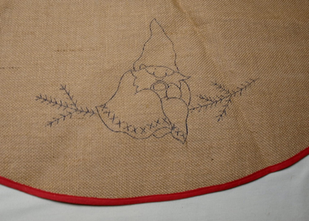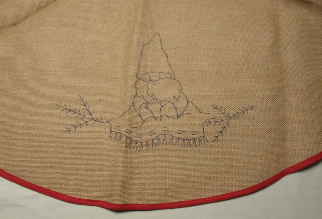 A karácsonyfatalp takaró színe: nyers juta szín piros szegéllyel.