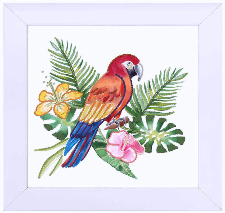 Élénk színekkel festett, papagáj őserdei környezetben előfestett hímezhető kép, amely vagány és pezsgő hangulatot visz otthonodba. Az előfestett pamutvászon megkönnyíti a hímzést, így nem kell a keresztszemeket számolni – a minta pontosan vezeti a kezedet. A kép keresztszemes technikával és tűfestéssel is elkészíthető, ezért kezdőknek és gyakorlott hímzőknek egyaránt ideális választás.